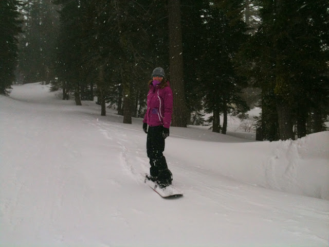 Snowboarding down a blue run at Sierra-at Tahoe, early in my snowboarding career.