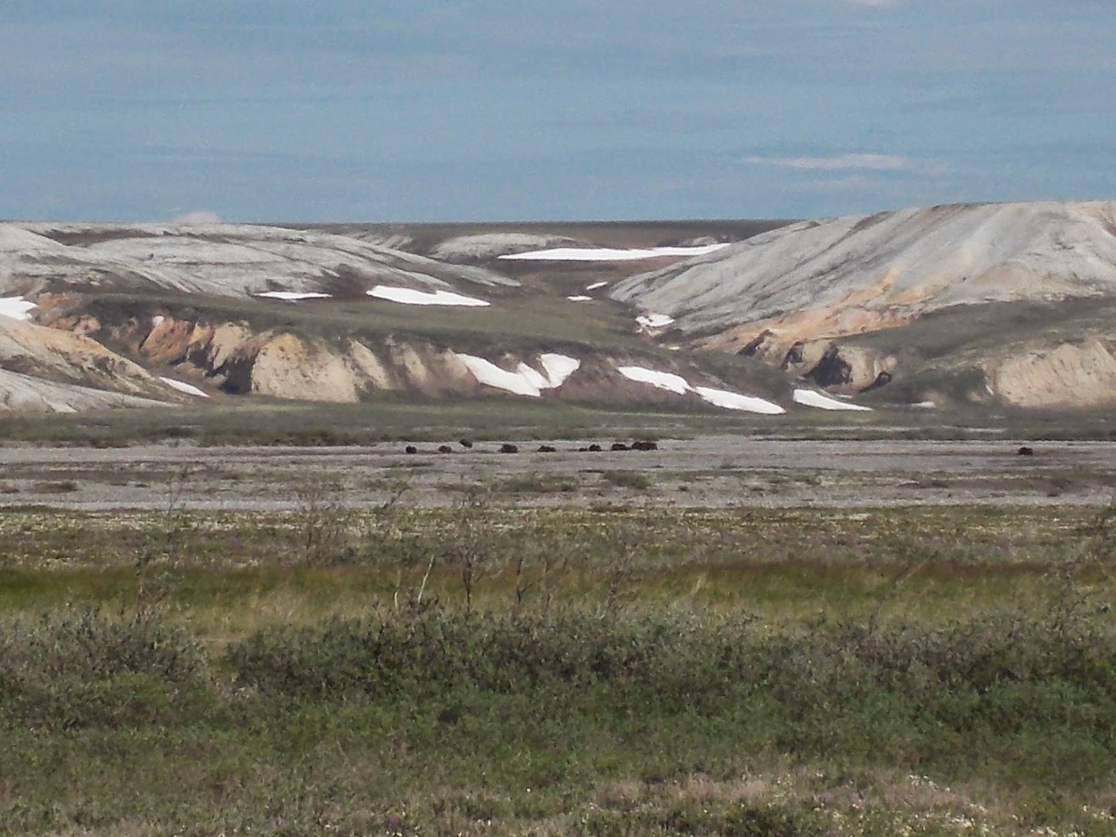 Arctic foxes are the primary road kill of the Dalton Highway, their bodies which were majestic in life, litter the highway.  More than once while driving our research truck, I had to slam on the brakes as a fox darted across the road in front of me.  Muskoxen are another odd animal only to be found in the tundra.  These cow-like creatures with their long fur coats and curved horns roam the tundra in groups that can be observed from the Dalton Highway.  They may even be smelled from the highway, as they are named for the strong musky odor emitted by males during the mating season.