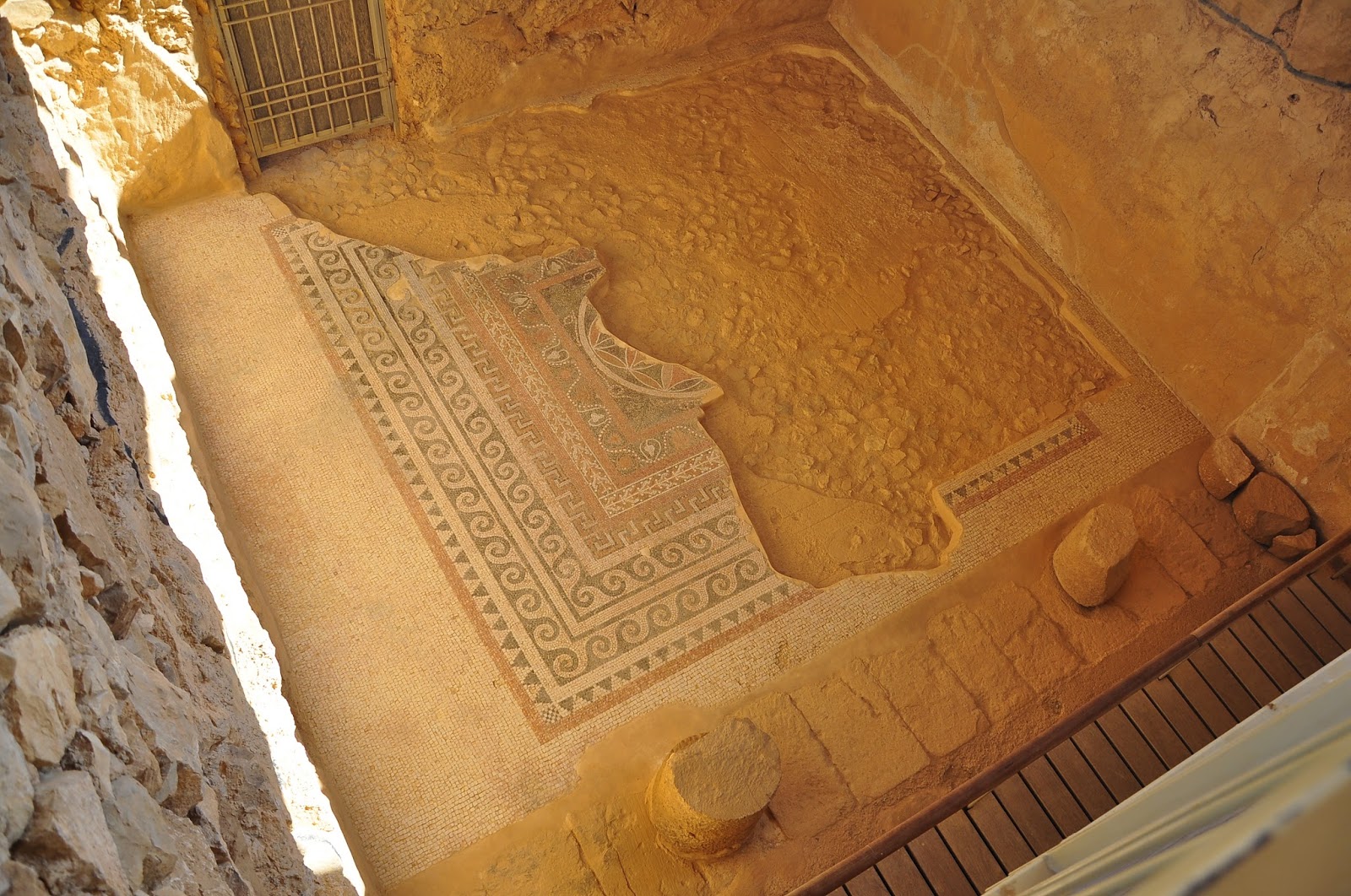 | A somewhat preserved mosaic floor in one of the palaces of Masada. |