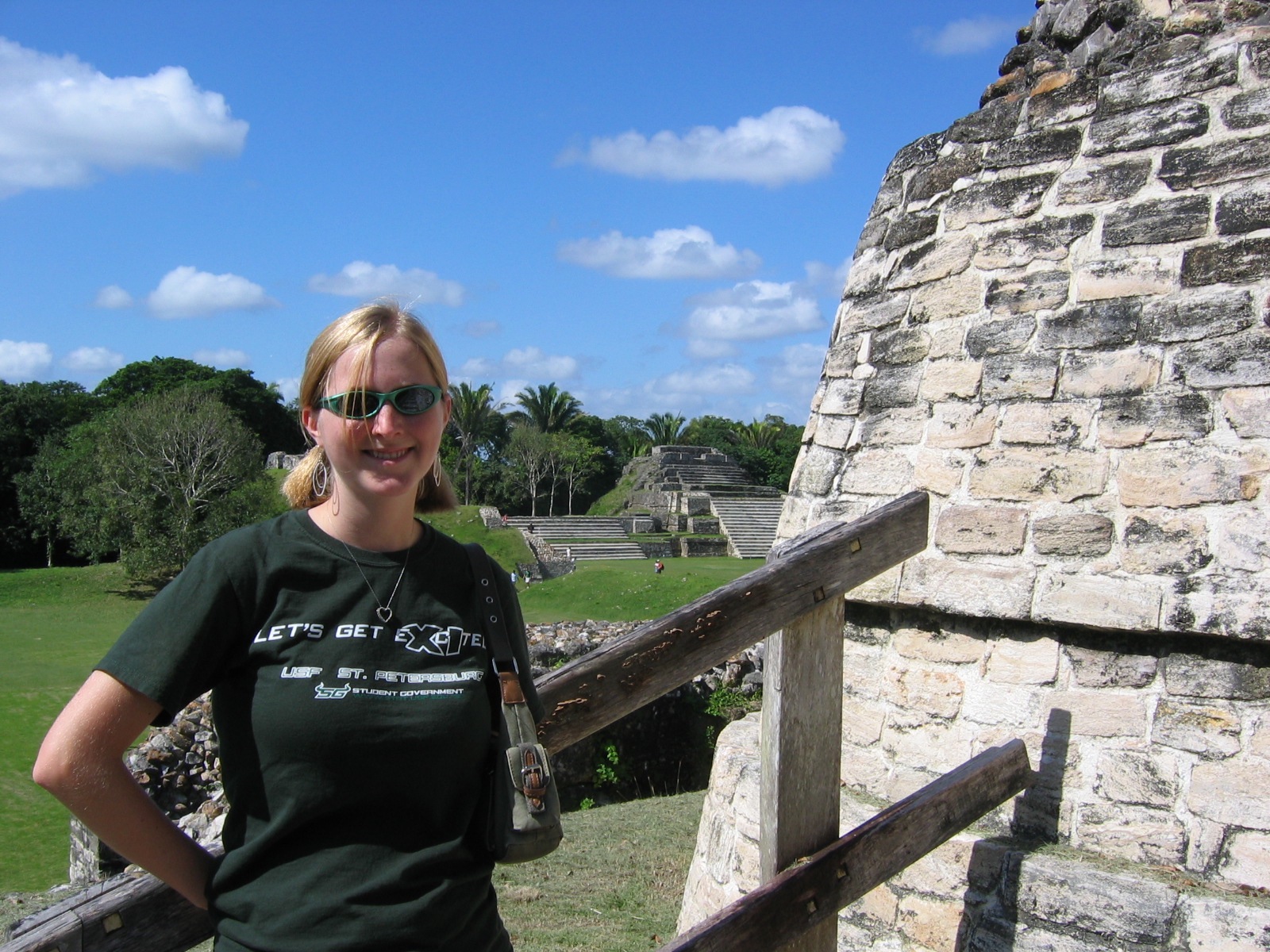 | Standing in front of the largest monument at Altun Ha, which reaches a height of 54ft. Visitors can reach the top by ascending a staircase built on the side of the monument. Stakes holding ropes prevent them from climbing up the face. |