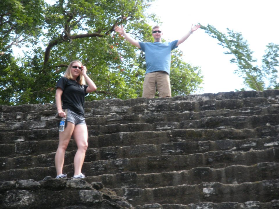 | Carefully making my way down the 120ft tall monument aptly named the High Temple at Lamanai. |