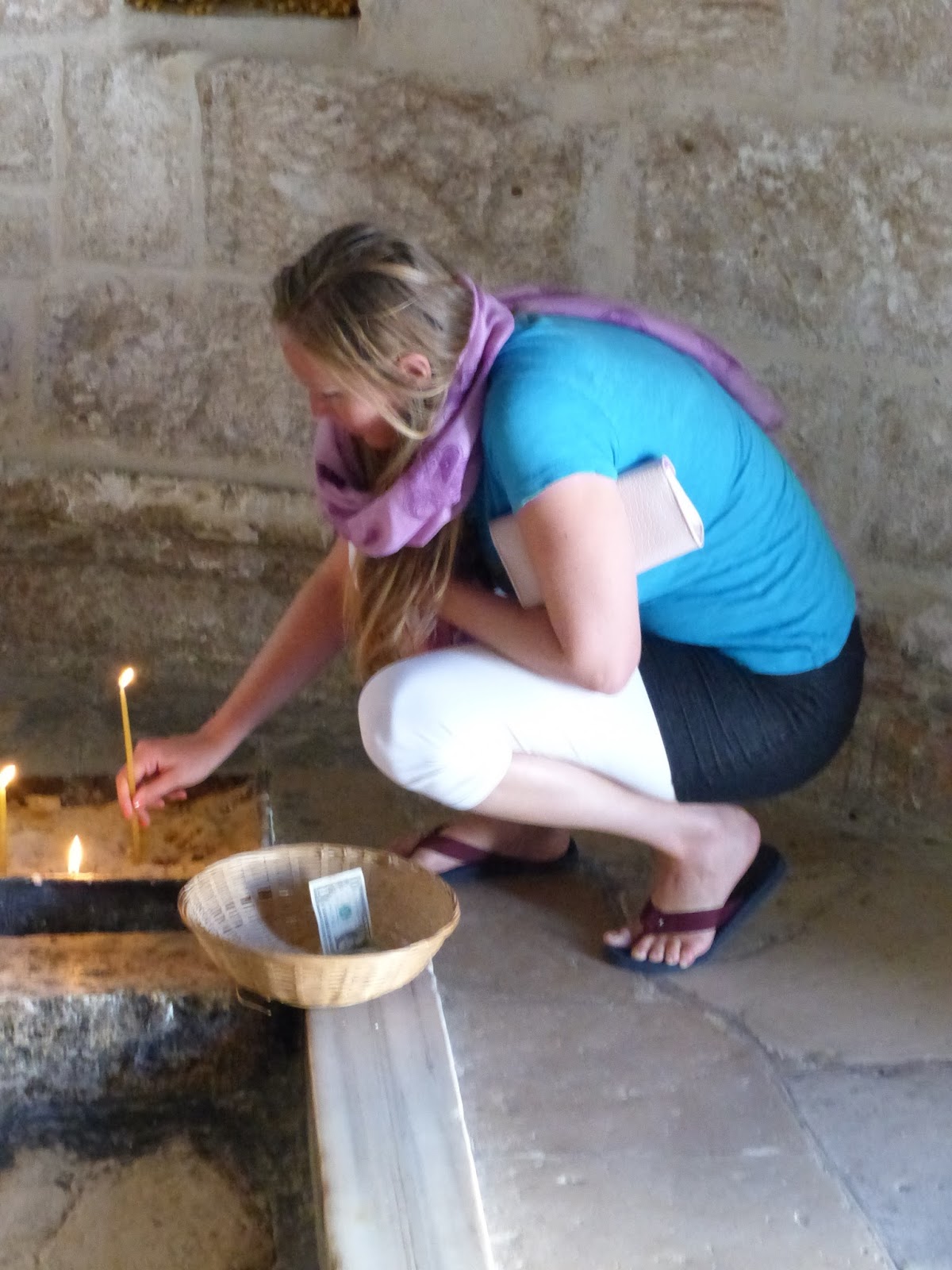 Lighting a candle inside the chapel on the Mount of Olives where Jesus ascended into Heaven. |