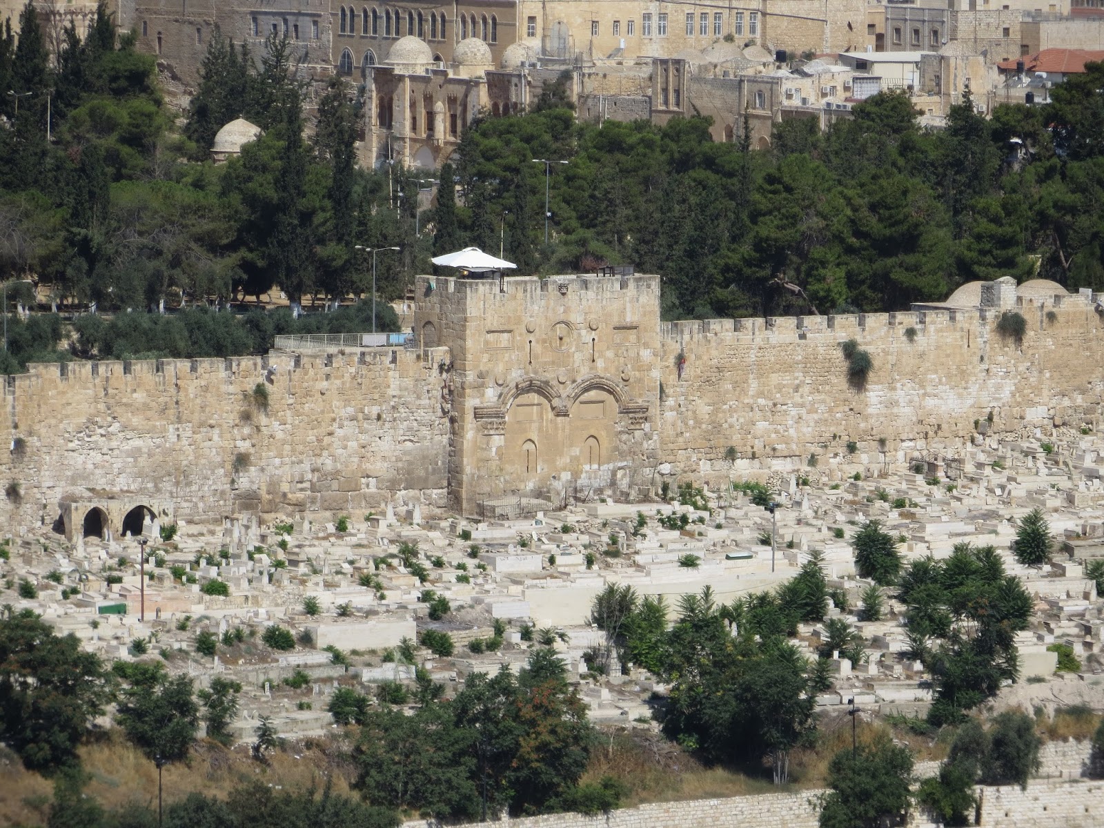 | The Golden Gate, now closed, which Jewish prophesy foretells the Messiah will ride through into Jerusalem. Jesus rode a donkey through this gate on Palm Sunday. Several muslims were buried in front of the gate in the hopes that it will prevent the coming of the Jewish Messiah, which kind of a way of conceding that their religion (Islam) might be wrong. |