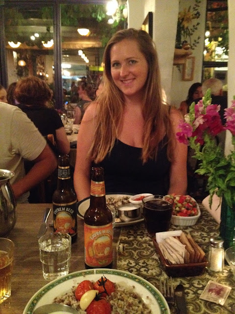 | Enjoying my crazy rice dinner, Arabic salad, and Palestinian beer at a cafe on the streets of Jaffa. Taybeh, a beer brewed by Palestinian Christians comes in light and dark versions. |