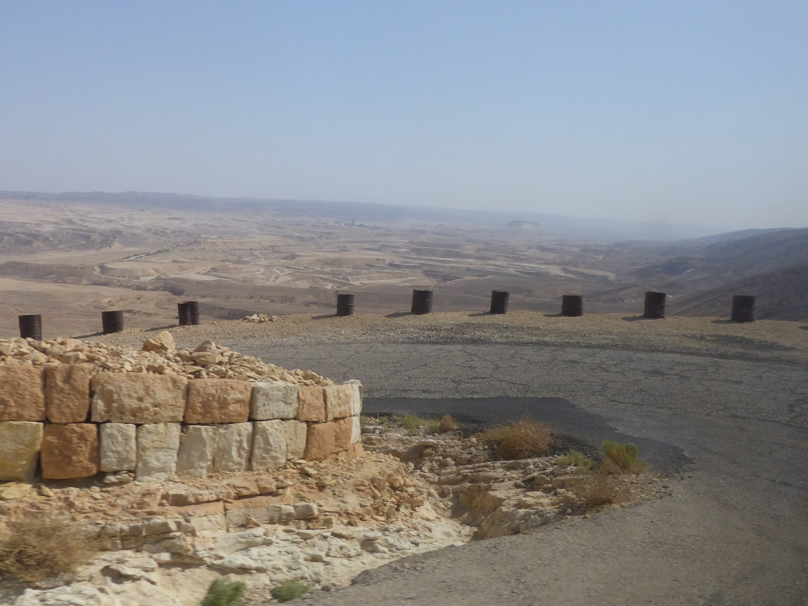 The fastest way down to the main road of the rift valley from the Small Maktesh and our last stop of the day, was the Scorpion's Descent built by the British about one hundred years ago. This descent consists of a winding single lane road for about a mile before repetitions of switch backs, lined with barrels in a lame attempt to prevent cars from careening off the road. I was the lucky driver who glided our massive mini van down the cliff side and into the valley, after which I switched drivers sitting in the back with a cold drink for the rest of the drive back.