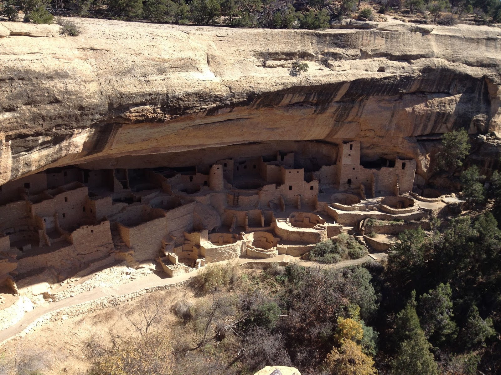 Mesa Verde (green table in Spanish) refers to the plateau into the steep sides of which cliff dwellings are carved. To access the dwellings visitors drive up a winding two lane road from the main visitor's center ascending the plateau. From the plateau summit, visitors can hike down trails to explore the cliff dwellings below. We visited Mesa Verde in November which like many of the other