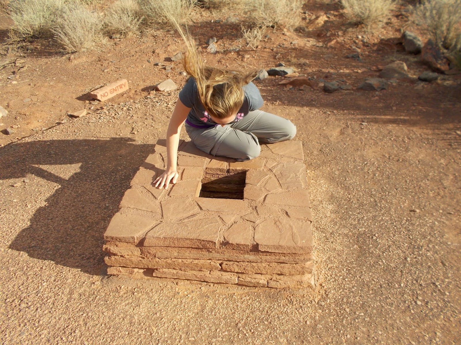 One cool geologic feature of the national monument, located just a stone's throw away from the ball court is a blow hole, so named, because hot air continually blows out of it. In these naturally occurring features, cold dense air sinks through a hole in the ground into a cave. This can happen in the winter or on cold nights. While underground the cold dense air is warmed by the surrounding warm ground. As the air warms it expands and becomes less dense, both of which cause it to rise out of the blow hole into the the atmosphere above. The blow hole dispels air at a constant and strong enough rate to make my hair stand on end when I looked down into its dark abyss.