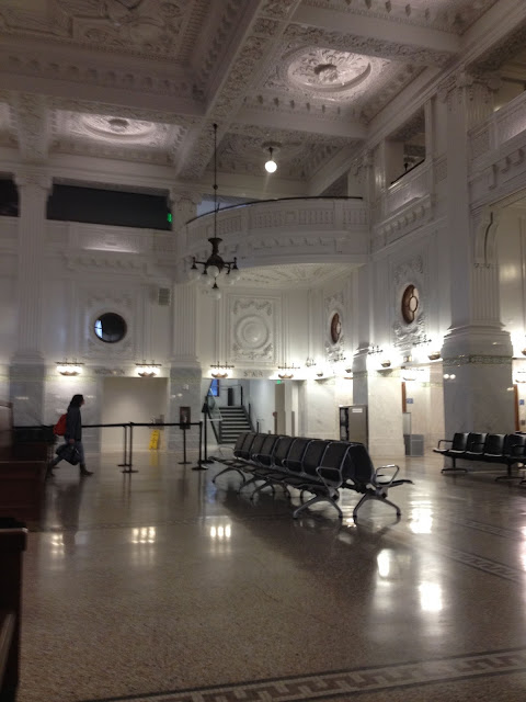 | Walking in the early morning light of the King Street Station as we wait for our seat assignment. |