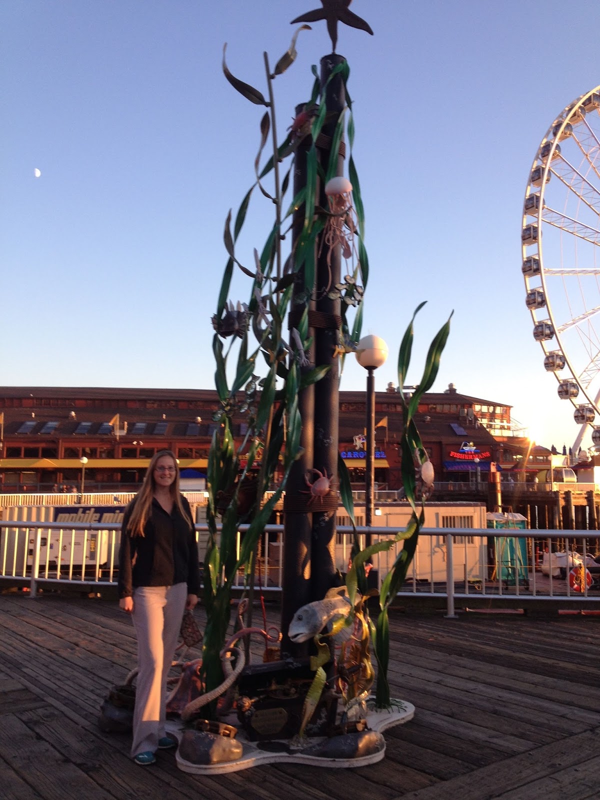 After dinner we descended a series of seemingly endless stairs to the boardwalk bordering the shore. Tired from our travels so far we only had enough energy for a hour's evening stroll on the boardwalk. Pieces of art dot the walkway, with an occasional pier sporting an attraction. Everything as cheesy as ferris wheels to as educational as an aquarium can be found on the boardwalk, with more seafood restaurants cluttering around them than I care to remember. They all seemed to emit a pungent fishy smell.