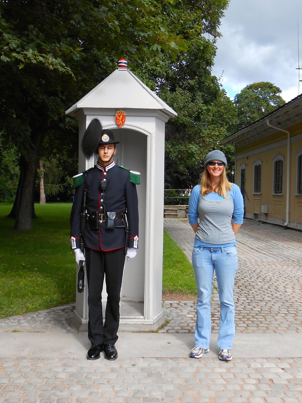 | Posing with a guard near the Royal Palace of Oslo. They are trained to keep their gun opposite of anyone posing with them. Some poor guards seem to constantly be switching the gun from side to side to comply with their training. |