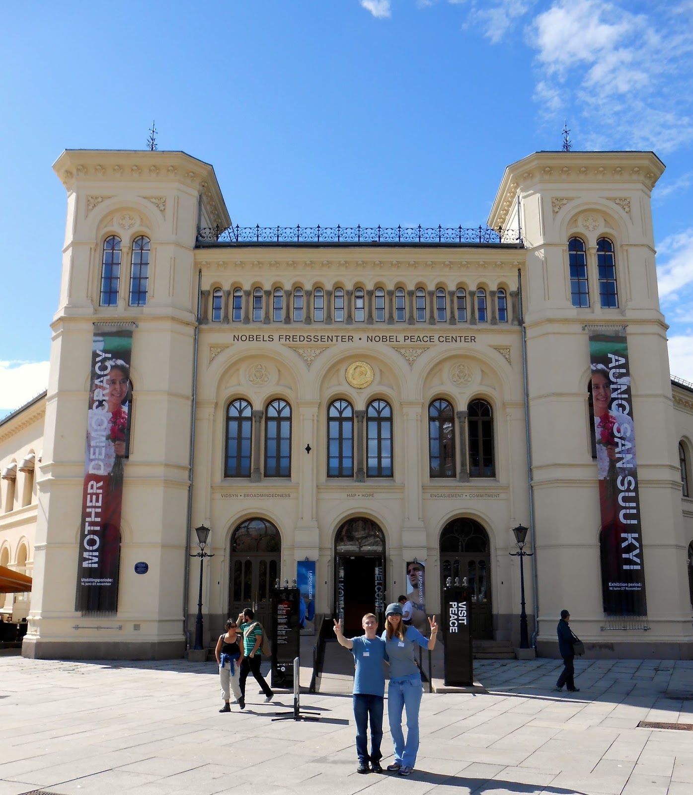 | Posing in front of the Nobel Peace Prize Museum on the waterfront in Oslo. The Peace Prize is the only Nobel Prize not handed out in Sweden. |