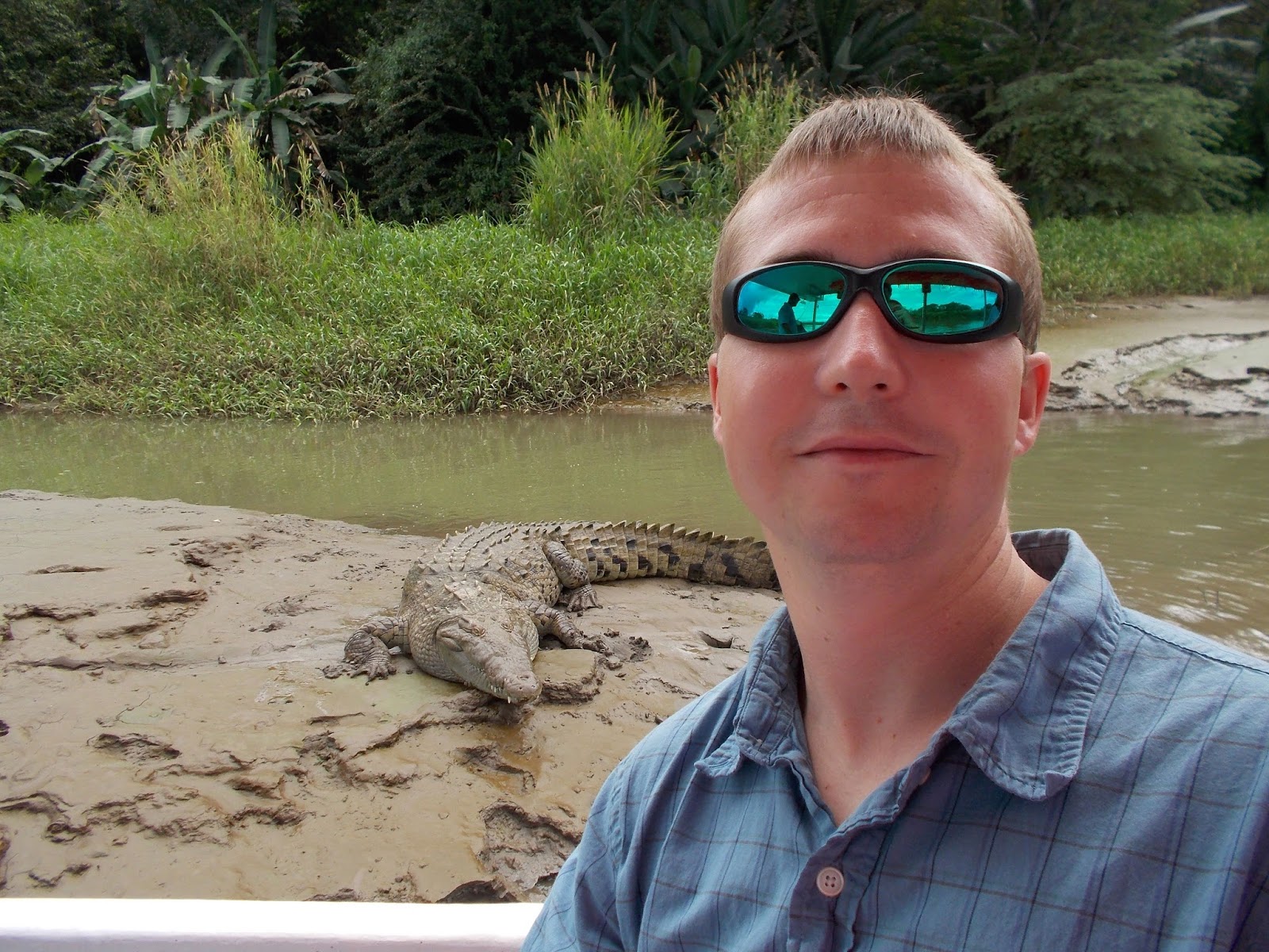 | One of the might crocodiles of Costa Rica poses patiently with my boyfriend. |