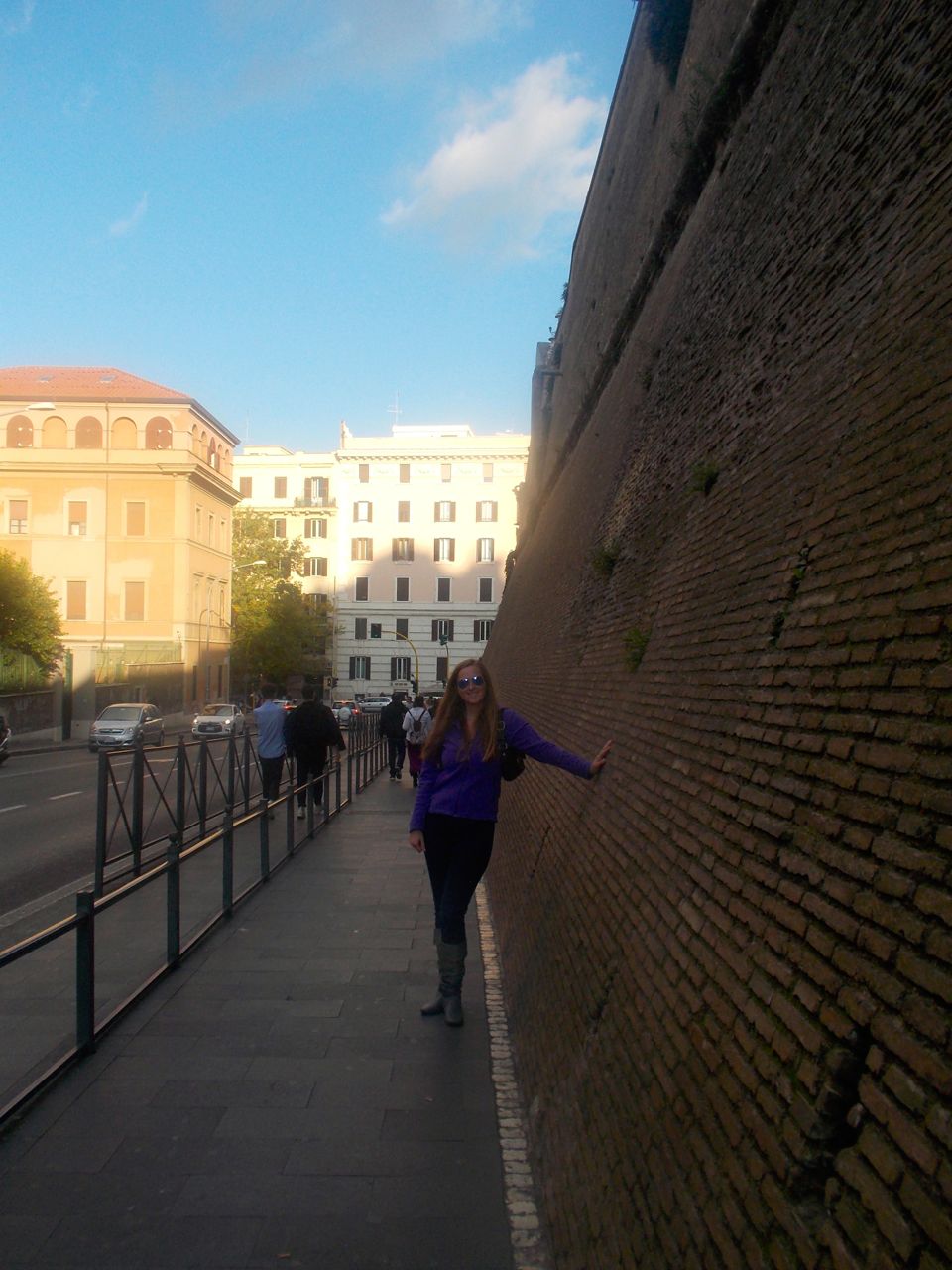| Standing in Italy with a hand on the Vatican wall which encircles most of this tiny country. |