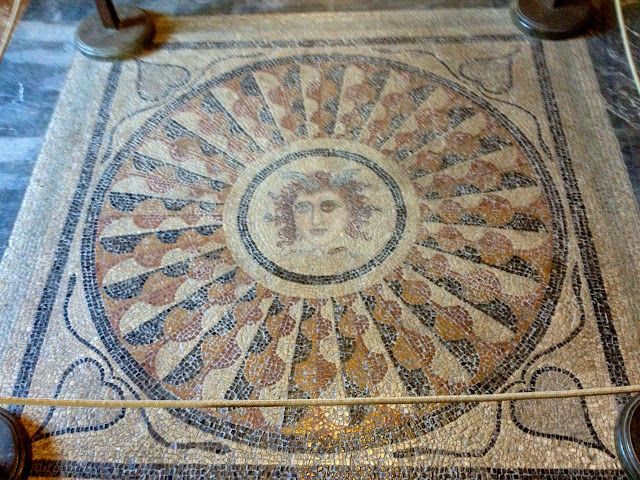 This ancient mosaic of Medusa was moved to the Palace of the Grand Master by Mussolini. Similar mosaics adorn the floors all over the palace. |