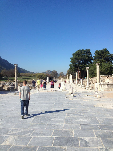 David walks down the port of Ephesus where the ocean once lapped at its docks. Today the ocean is miles away due to tectonic uplift of the area. |