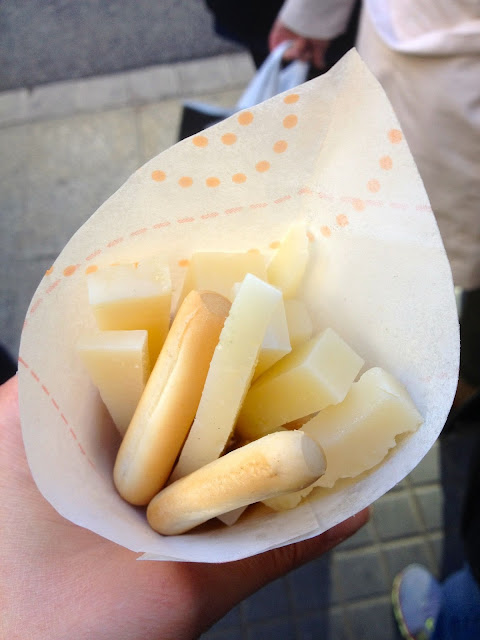 I picked a pinchon restaurant from an online source, and we marched there ready to eat. I dove in to all of the Spanish and Catlonian specialties: the egg-based tortilla, quince paste with manchego, and the ever present anchovy. I don't like anchovies or sardines, but Spaniards devour them. I decided on my way to restaurant my dislike of them was merely superficial since I had not to my knowledge eaten one. So with all the bravery in my heart I chose a pinchon with anchovy and put it on my plate. I waited to eat that particular pinchon until I had finished with the others not wanting the flavor to over power the delicate flavors of the other pinchon, which were delicious by the way. I readied myself and put the anchovy in my mouth. It was pungent. Even now writing this I don't know how I got it down. David, who actually likes anchovies, tried to keep from breaking out laughing from the faces I made. Despite the fact I did not like the anchovy, I tried something new, and proud of myself we bough some beers on our way back to the hotel.