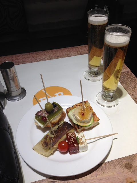 Riding the high of the walking tour, I was determined to eat dinner in a truly Catalonian style restaurant, a pinchon on restaurant. While tapas are common to most of Spain, they really aren't that common outside of the touristy areas of Barcelona. Instead, the Catalonian region serves pinchon. Meaning to pinch, pinchon are bite sized pieces of food pierced with a skewer and served on a bar. To eat pinchon, patrons walk up to the bar filled with pinchon, and grabbing the skewer place whatever they want on their plate. After eating their skewered morsels, patrons put the skewer in a skinny metal cup on the table, and when they are ready to leave, a waitress counts the number of skewers, multiplies the number of skewers by a set price, usually one to two euros, and tells the guest the tally. It is an affordable and fast way to eat some very Catalonian style food.