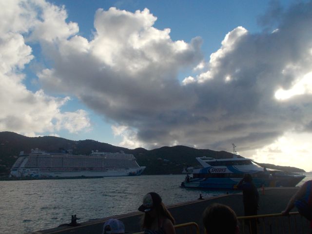 We bought some sodas at a restaurant near the parking lot before wandering into the parking lot in search of a Speedy's taxi. The taxi drivers found us via the neon wristbands we sported and directed us into which cab would shuttle us back to the ferry. We rode back with several members of the crew from a show on board. Our ferry had not yet arrived when we got back to the Virgin Gorda port, so we bought a few Virgin Island ginger beers and enjoyed the view and the breeze. The ferry arrived ten minutes later.