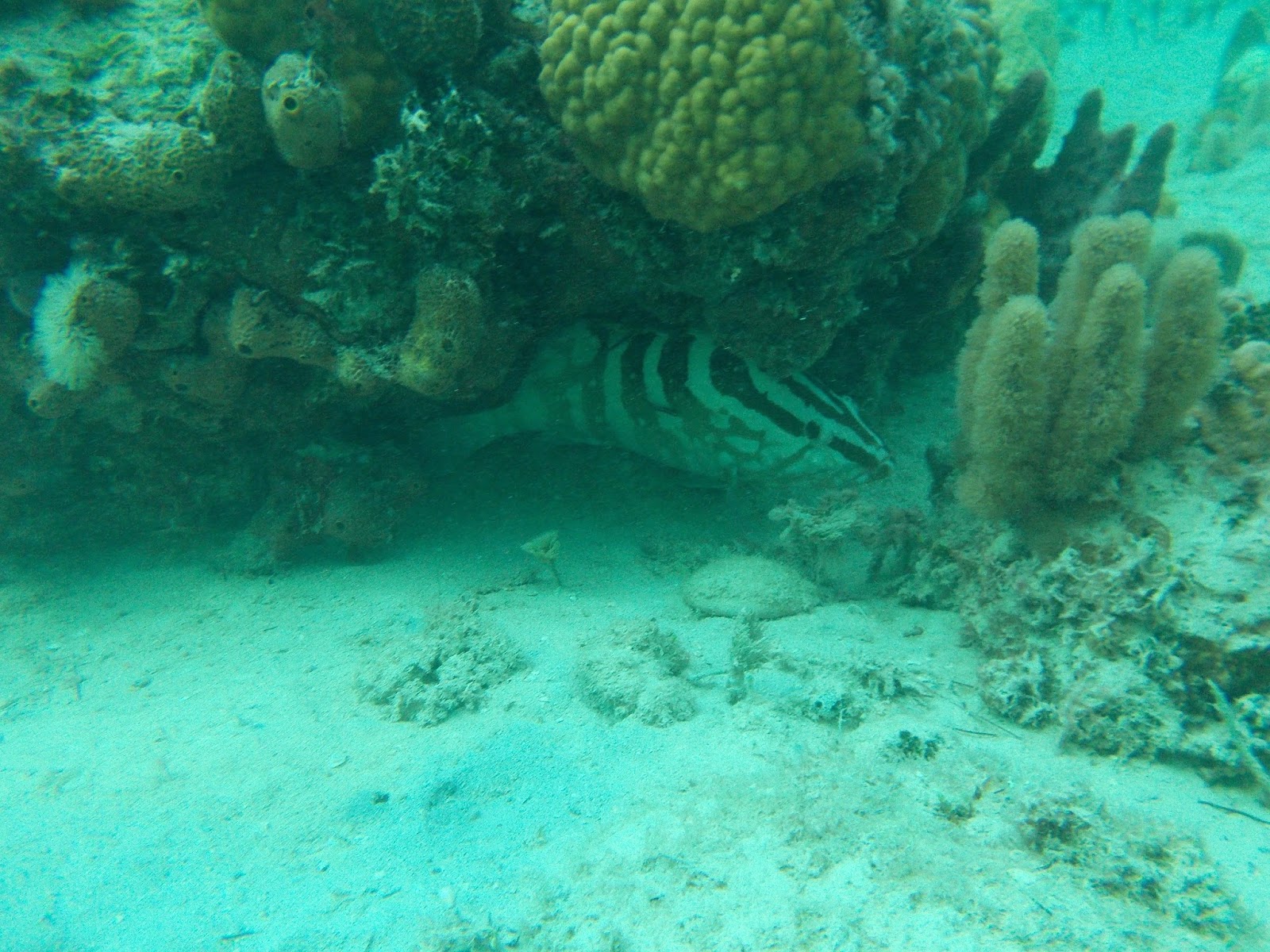 | A grouper hides under some coral. They were abundant on the reef. |